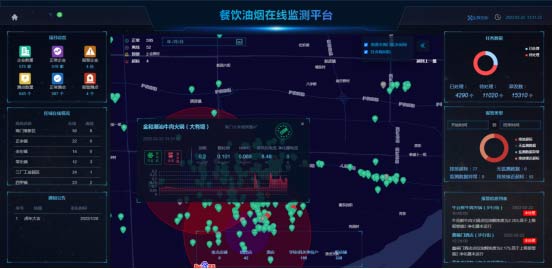 全屏展示界面UI可定制,顯示內容可根據需求調整;地圖點位可根據監測狀態以不同顏色區分,根據區域內油煙濃度情況,劃分不同熱力區塊,凸顯主要區域,地圖可顯示省控點周邊1km和3km區域范圍。