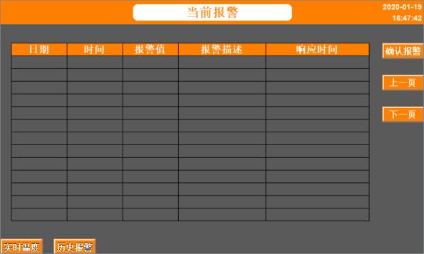 進入“當前報警”界面,顯示的是當前告警發生情況,如圖3.4;若要查看所有歷史告警,進入“歷史報警”界面。在“當前報警”界面查看實時發生的報警,有報警時,此界面顯示出報警提示,并且蜂鳴器鳴叫,在蜂鳴器鳴叫時,點擊確認報警,蜂鳴器會停止鳴叫,同時報警提示的字顏色會變為藍色,當報警故障接解除后,報警提示會消失。