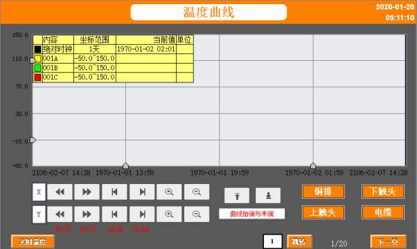 進入“溫度曲線”界面,每一個頁面存有12條曲線,共20頁。每5分鐘記錄一次溫度,可以存儲300天。具體曲線要求可在屏上自行調節。