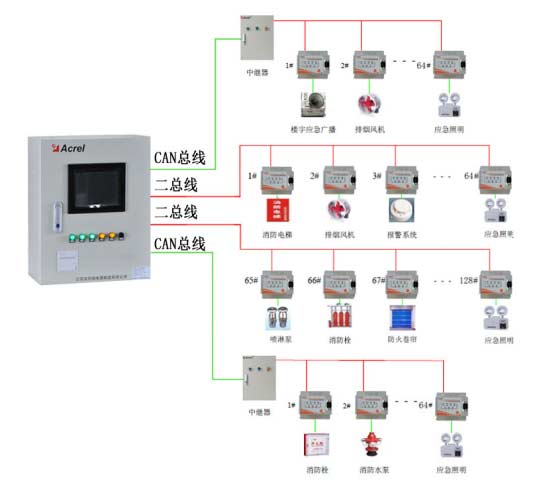 在本項目的設計中,按需選用了消防設備電源監控器(主機)、電壓傳感器、電壓/ 電流傳感器。采用二總線通訊方式,布線方便。