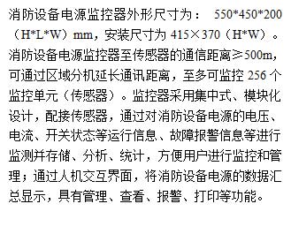 1 消防電源監控器應設置在消防控制室內,用于監控消防電源的工作狀態,故障時發出報警信號。