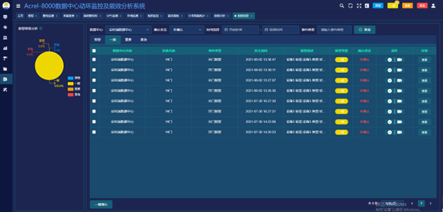 6.3.9告警分析:同時對數(shù)據(jù)中心所有報警進(jìn)行統(tǒng)計(jì),提供同環(huán)比的數(shù)據(jù)比對,幫助用戶改進(jìn)數(shù)據(jù)中心,保障其正常運(yùn)行。