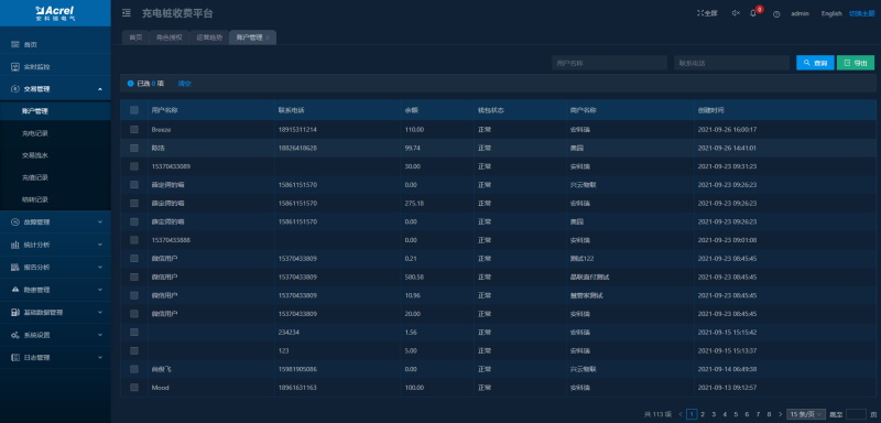 顯示所有關聯充電用戶的賬戶信息,可進行充值、退款、凍結、解凍、注銷等操作。