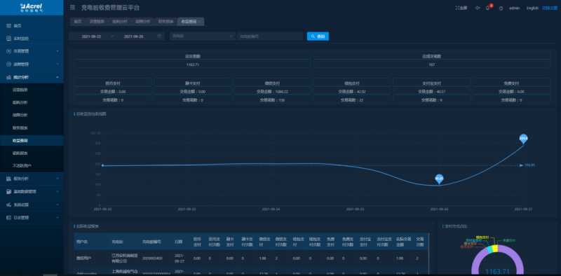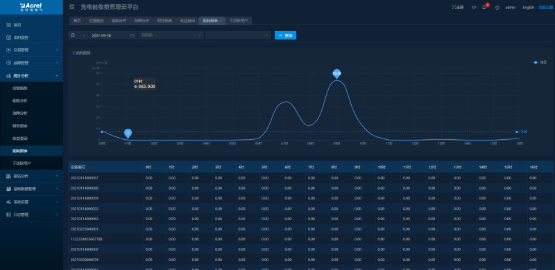 可查看指定時段充電站和充電樁的用電量,顯示對應的能耗趨勢圖并進行同環比分析。