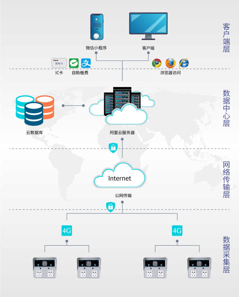 AcrelCloud-9500電瓶車充電樁收費(fèi)平臺采用分層分布式結(jié)構(gòu)進(jìn)行設(shè)計(jì),現(xiàn)場安裝雙路智能插座,經(jīng)過協(xié)議轉(zhuǎn)換、壓縮加密后通過4G定時(shí)上傳或觸發(fā)式上傳平臺,平臺可完成對現(xiàn)場所有智能設(shè)備的數(shù)據(jù)交換,實(shí)時(shí)監(jiān)測電瓶車充電樁的狀態(tài)及充電過程,并完成微信、支付寶在線支付。
