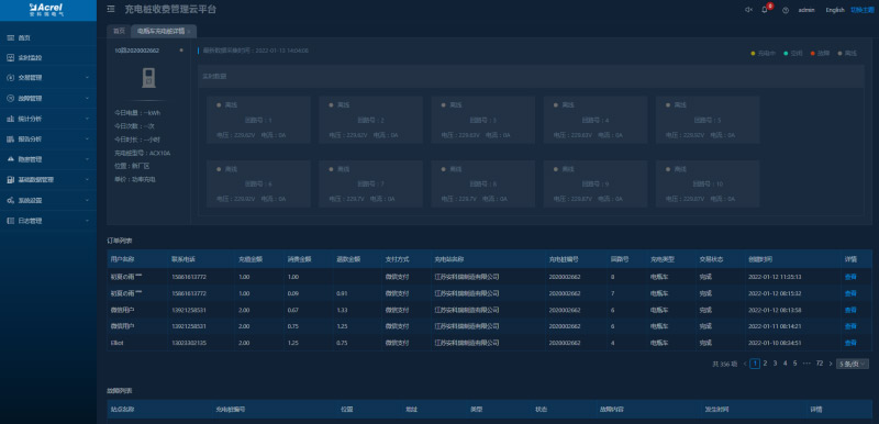 顯示充電樁各回路的狀態(tài)及充電數(shù)據(jù),統(tǒng)計(jì)充電樁今日充電數(shù)據(jù)、訂單記錄、故障信息,可以查看訂單和故障的詳情。