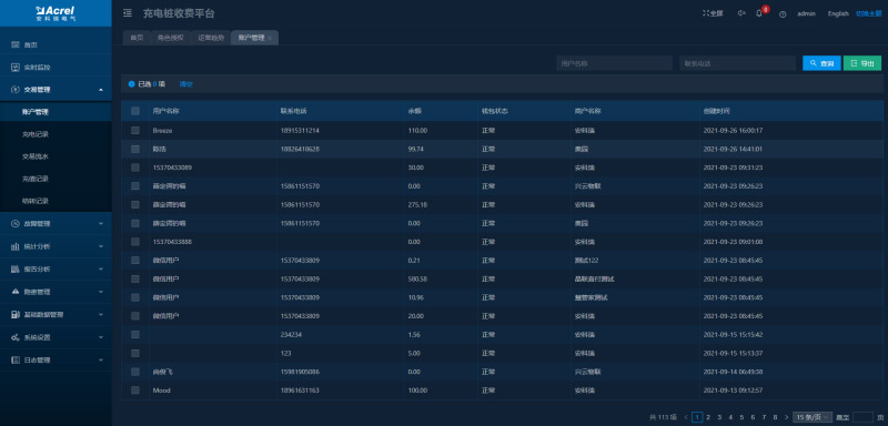 顯示所有關(guān)聯(lián)充電用戶的賬戶信息,可進(jìn)行充值、退款、凍結(jié)、解凍、注銷等操作。
