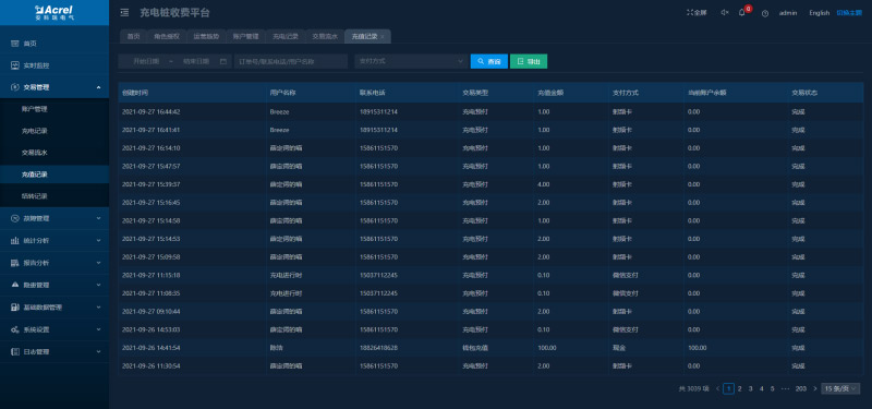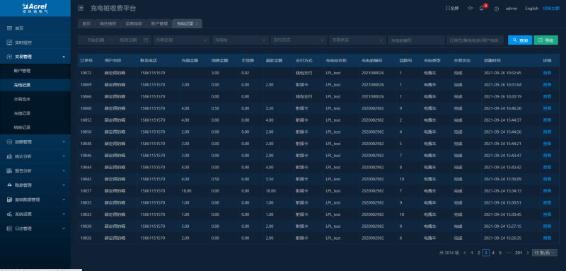 顯示所有訂單數(shù)據(jù),可以對訂單按照充電站、充電樁、支付方式、交易狀態(tài)等進(jìn)行分類查詢,可對充電中的充電樁進(jìn)行停止充電操作。
