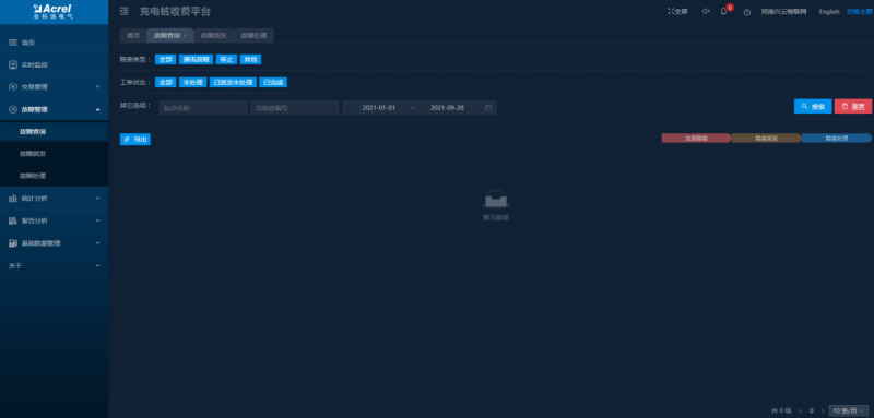 顯示充電樁的故障信息及處理進(jìn)度,故障類型包括過壓、欠壓、空載、絕緣檢測故障、漏電、過溫、短路等。