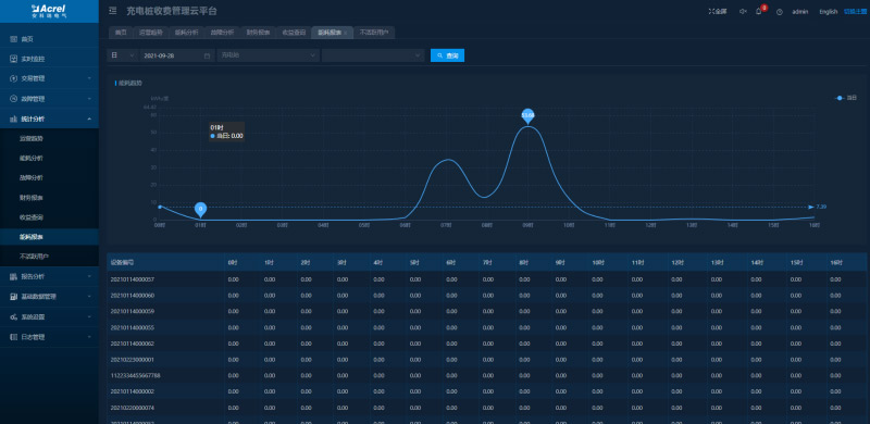 可查看指定時(shí)段充電站和充電樁的用電量,顯示對應(yīng)的能耗趨勢圖并進(jìn)行同環(huán)比分析。