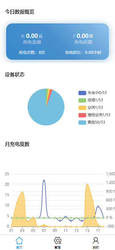 可按日、月、季度、年查看充電次數(shù)、充電時(shí)長、充電金額,同時(shí)顯示對應(yīng)的曲線圖。