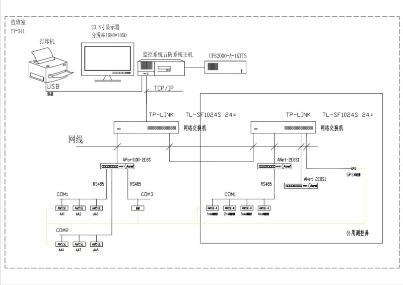 在10kV開關室內配置通訊管理機1臺,實現(xiàn)10kV開關柜微機保護裝置的數(shù)據采集;在電氣監(jiān)控室的通訊屏上配置通訊管理機1臺,實現(xiàn)10kV開關柜微機保護裝置、測控裝置、直流屏以及其它智能設備的數(shù)據采集。在電氣監(jiān)控室配置監(jiān)控系統(tǒng)和微機五防系統(tǒng)主機1臺、用于實現(xiàn)變電站的遙測、遙信、遙控、報警、報表、操作票、防誤操作等相關功能。監(jiān)控系統(tǒng)按照單網組網方式,實現(xiàn)變電站內數(shù)據采集與實時監(jiān)控。系統(tǒng)組網拓撲圖如下: