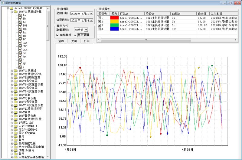 Acrel-2000電力監(jiān)控系統(tǒng)在曲線查詢界面,可以直接查看各電參量曲線,包括三相電流、三相電壓、有功功率、無功功率、功率因數(shù)、溫度等曲線。并統(tǒng)計該曲線查詢范圍內發(fā)生時間、平均值等。