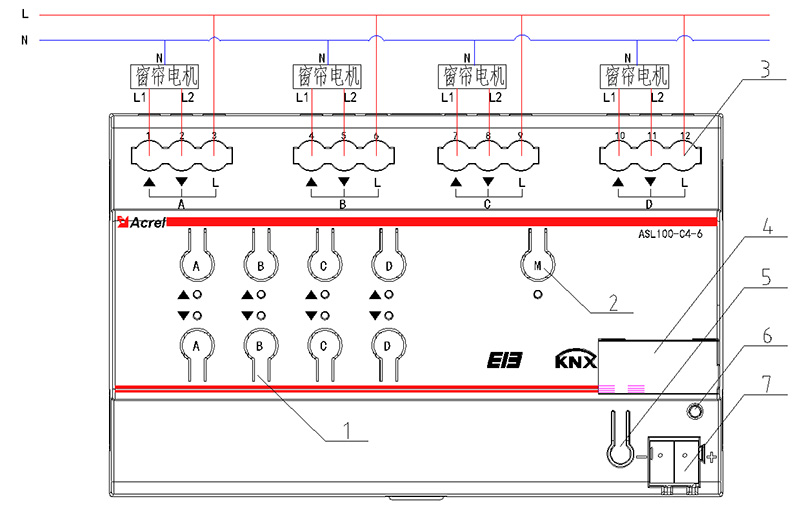 上圖為4路窗簾驅(qū)動(dòng)器的接線示意圖。在實(shí)際項(xiàng)目使用中,2路窗簾驅(qū)動(dòng)器的接線和4路模塊類似,在此就不一一列出。現(xiàn)對4路窗簾驅(qū)動(dòng)器接線圖進(jìn)行說明。
