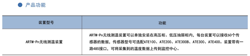 ARTM-Pn無(wú)線測(cè)溫裝置:ARTM-Pn無(wú)線測(cè)溫裝置可以單獨(dú)安裝在高壓柜、低壓抽屜柜內(nèi),每臺(tái)裝置可以接收18個(gè)傳感器的數(shù)據(jù),傳感器型號(hào)可選配ATE100、ATE200、ATE300。裝置帶有一路485接口,可將采集到的溫度數(shù)據(jù)上傳到監(jiān)控中心。
