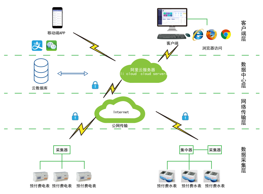 對于分布不同省、地市或同地市不同區(qū)域的連鎖商業(yè)、集團、百貨、門店、物業(yè)、院校等業(yè)務分散,要求集中管理、線上支付,低額提醒、欠費告警。但常規(guī)的本地插卡付費、本地預付費并不能完全滿足客戶管理需求,預付費云平臺應運而生。AcrelCloud-3200水電預付費云平臺無縫集成商業(yè)、物業(yè)公司、集團企業(yè)、院校等分散布置的安科瑞DDSY/ADF系列電子式預付費電能表、閥控智能水表等,提供微信、支付寶、銀聯(lián)等可選的在線支付方式,大大方便了用戶充值、圈存,提供預警和充值、退費、電能消耗等記錄查詢,方便用戶和管理方的數(shù)據(jù)統(tǒng)計和財務分析,提供先交費后使用的管控機制,大大降低了管理部門的收費成本。