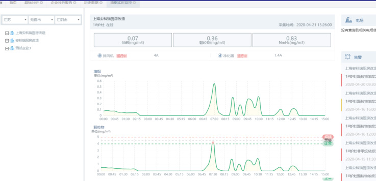 對油煙排污數(shù)據(jù)的監(jiān)測,包括油煙排放濃度,顆粒物,NmHc等數(shù)值采集監(jiān)測;同時對監(jiān)控風(fēng)機和凈化器的啟停狀態(tài)、運行數(shù)據(jù)進行監(jiān)測。
